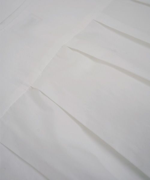 後タックが特徴のシンプルなホワイトシャツ。 小さめの襟に比翼仕立てでシンプルに、後身頃にタックを入れ動きを出しました。 生地にはワッシャー加工をしたオーガニックコットンを使用したブロード生地を使用。 素材の持つ風合いを極力残すように仕上げをし、自然な膨らみ感とドライなタッチが特徴の素材です。 また仕上げのワッシャー加工で自然なしわ感を出しています。 ボタンには上質な天然の本水牛ボタンをつけました。