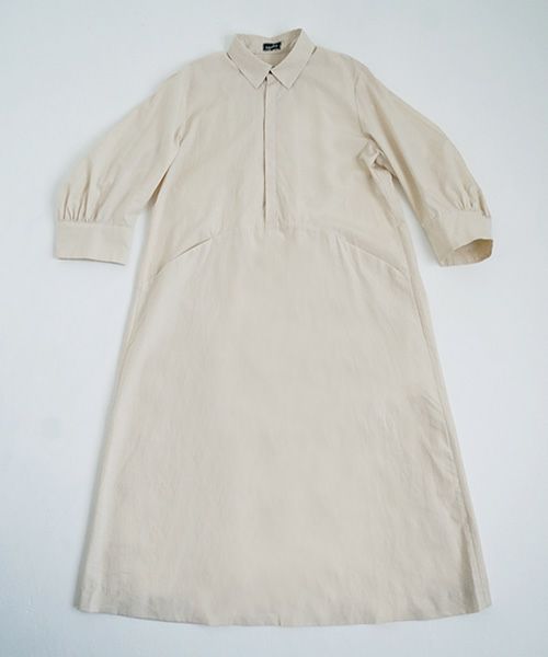 弧を描いた前ウエストの切り替えが特徴のシャツワンピース。前ウエストの切り替えに沿って前ポケットが配置されています。フワッとさせた袖も特徴。ハリのあるコットンリネンのタイプライター生地を使用。天然本水牛オリジナルボタン。