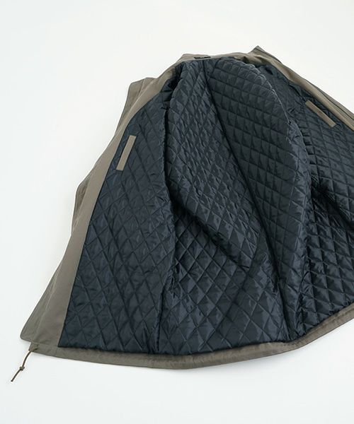 このコートの表地には、最高峰のコットンブランド「フィンクスコットン」を使用しています。特殊な加工により、マットでぬめり感のある優しい肌触りの厚手の生地でしっかりと仕上げられています。裏地には、ふんわりとしたシルエットを演出するために、格子のキルト生地が使われています。