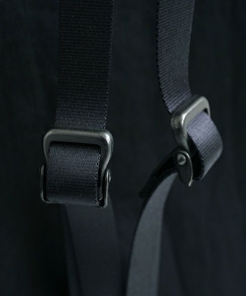 肩のショルダーベルトはオリジナルで加工染めされたマッドブラックの金具が使用されており、長さを調整することで、バッグを背負ったときの位置を自由に変えることができます。好みや身体に合わせて最適な位置を見つけることができます。