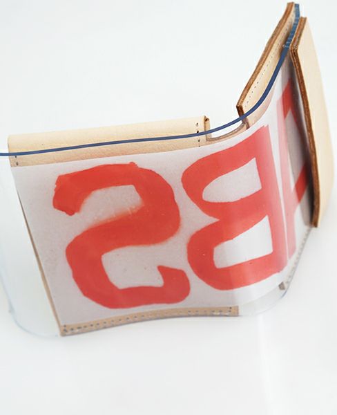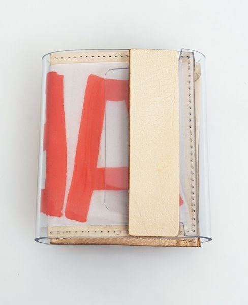 PVCのクリアと、薄く繊細な色合いのヌメ革とのコントラストが絶妙。レザーを額装したかのような、美しいミニマルなデザイン。