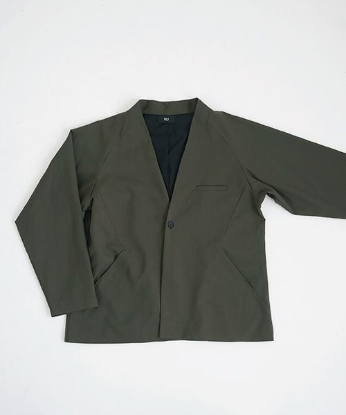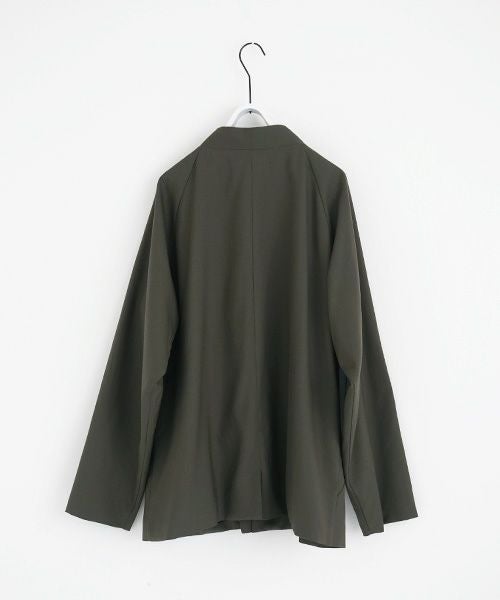 ゆったりラグランスリーブのワンボタンノーカラージャケット。