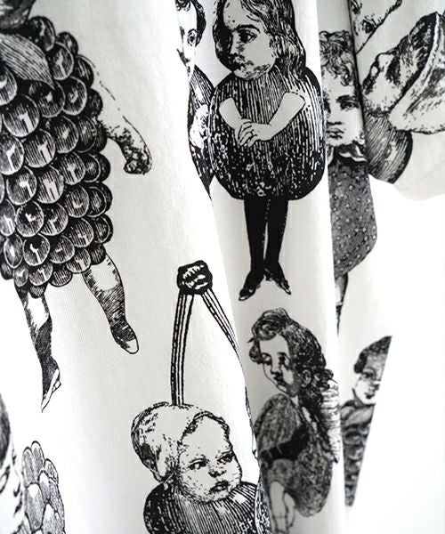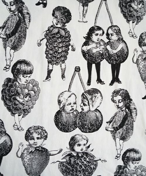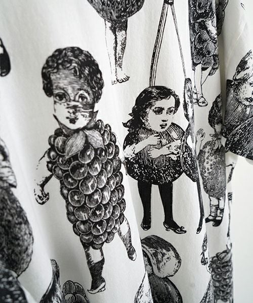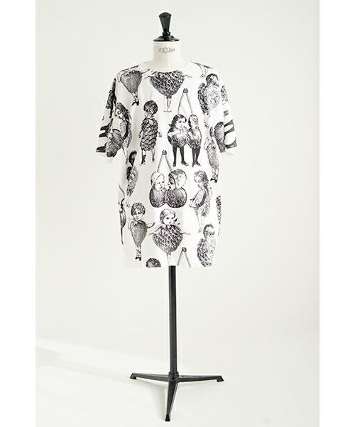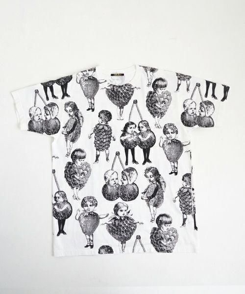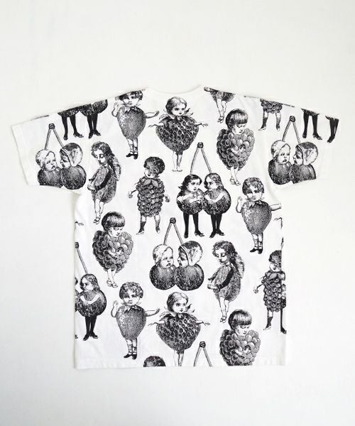 人気のフルーツ女の総プリント柄のプリントBIG Tシャツ。 いろいろなフルーツの形の顔が、あちゃちゅむらしい独特の世界観でかわいいです。 定番Tシャツより大きなサイズ感で、 下にレギンスなどを合わせて着ていただいてもかわいいです〇