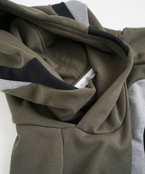 人工的な曲線を思わせる多数の切替デザインが特徴で、前身頃、袖、フード、また背中にも曲線的な切替で未来的なイメージに。ゆったりめのシルエットで男女ともに着用可能で、ウエストのあたりのパッチポケットも身頃の雰囲気にあわせて曲線的な形で貼り付けられている。裏毛生地はポリエステルとコットンによる混毛生地で、シワのつきにくさや手触りの滑らかさが特徴的。