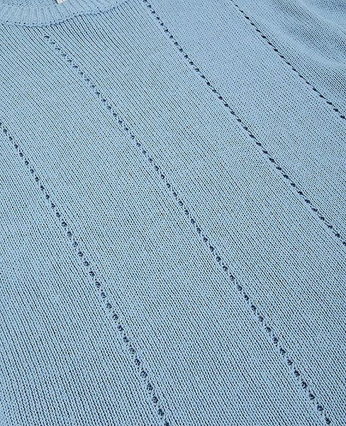 滑らかや素材感とシャリ感のあるドライタッチな生地は、コットン、レーヨンの糸に紙を織り込むことで実現。見た目以上に涼しげで、スリーブはゆとりのある着物スリーブ、縫い目の無いホールガーメントを採用することで、3シーズン着用可能。 編地もインナーを変えることでストライプ模様に。