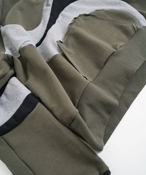 人工的な曲線を思わせる多数の切替デザインが特徴で、前身頃、袖、フード、また背中にも曲線的な切替で未来的なイメージに。ゆったりめのシルエットで男女ともに着用可能で、ウエストのあたりのパッチポケットも身頃の雰囲気にあわせて曲線的な形で貼り付けられている。裏毛生地はポリエステルとコットンによる混毛生地で、シワのつきにくさや手触りの滑らかさが特徴的。