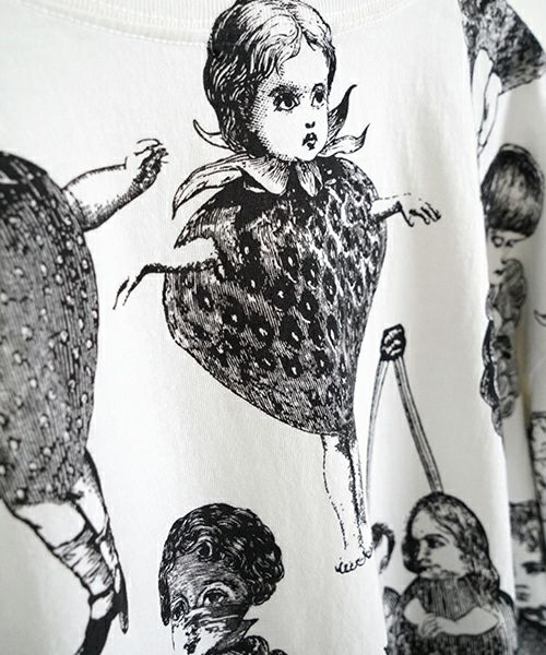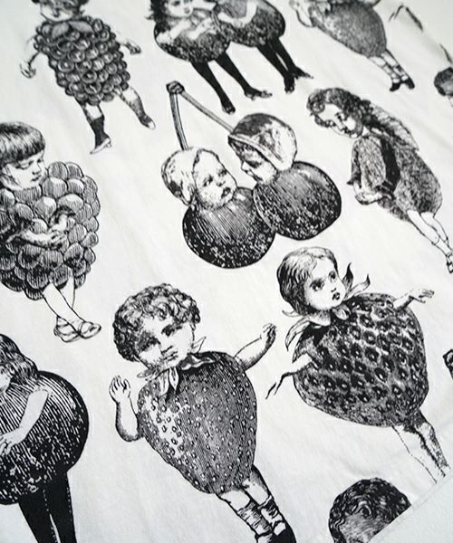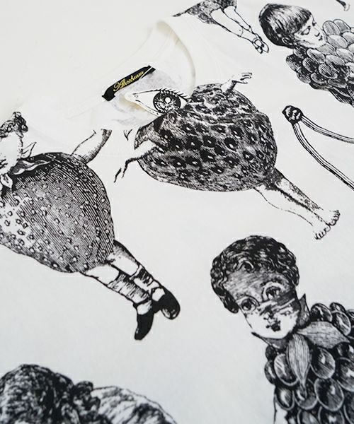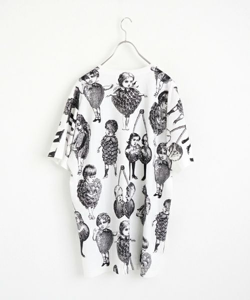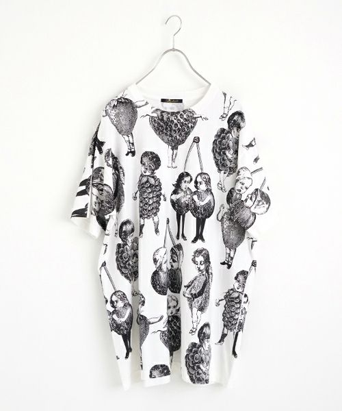 人気のフルーツ女の総プリント柄のプリントBIG Tシャツ。 いろいろなフルーツの形の顔が、あちゃちゅむらしい独特の世界観でかわいいです。 定番Tシャツより大きなサイズ感で、 下にレギンスなどを合わせて着ていただいてもかわいいです〇
