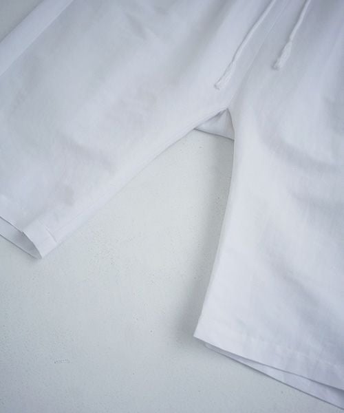 ウエストドローコードベルトでラフな「wide short pants」。 裾周りにゆとりを持たせて可動域を広げ、ストレスなくゆったりシルエットで着用頂けます。 リネン混のストレッチ性も持ちハンドウォッシャブルの為、 家庭での取り扱いも簡単です。洗濯可。裏地付きで透けの心配も大丈夫です。 「basic shirt」/「gown coat」と同素材使いでセットアップ合わせで コーディネートをお楽しみいただけます。made in japan