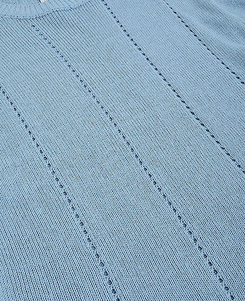 滑らかや素材感とシャリ感のあるドライタッチな生地は、コットン、レーヨンの糸に紙を織り込むことで実現。見た目以上に涼しげで、スリーブはゆとりのある着物スリーブ、縫い目の無いホールガーメントを採用することで、3シーズン着用可能。 編地もインナーを変えることでストライプ模様に。