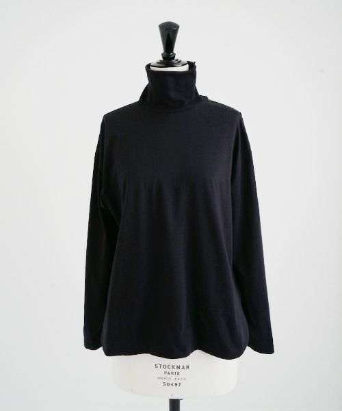 上品な光沢感のあるコットンシルク生地のタートルネックカットソー。