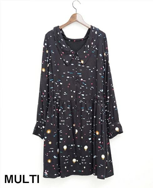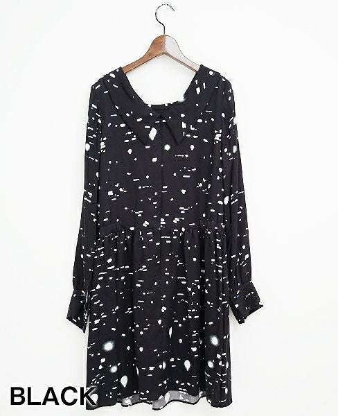 アイテム名のように、無数の光がプリントされたサテンの生地は、ジュンオカモトの今期のオリジナルテキスタイルです。衿のデザインは気分にあわせて、ロールカラー、Vネック、前後どちらでも着れるような襟ぐりになっています。裏付き。