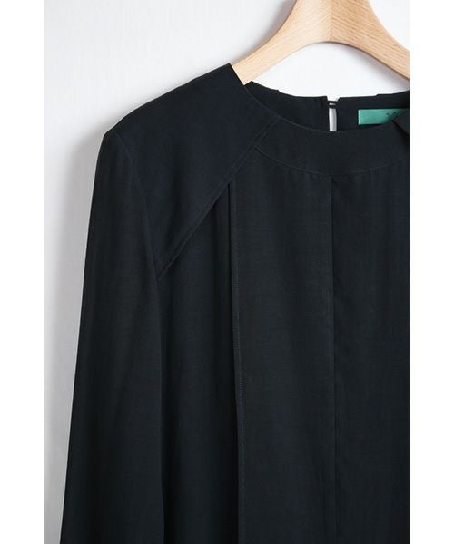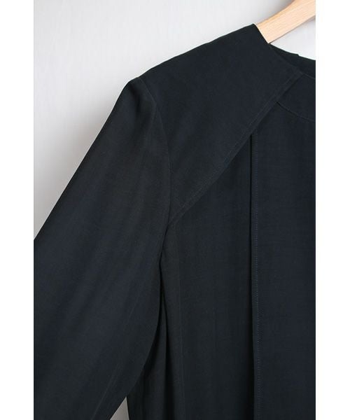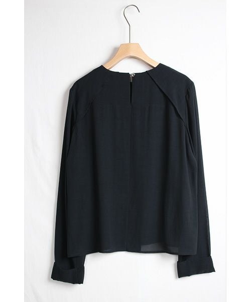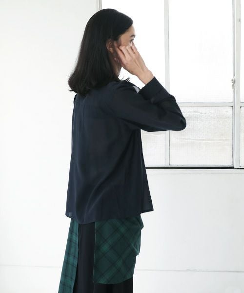 縦横共に強撚糸を使用した、肌離れも良いサラッとした軽い素材感。 切り替えや、ヨークパーツのレイヤーで構成したパターンと、幅広くとった縫しろ、長い袖を折り返したような袖口のデザインが特徴的。 水洗い可能。