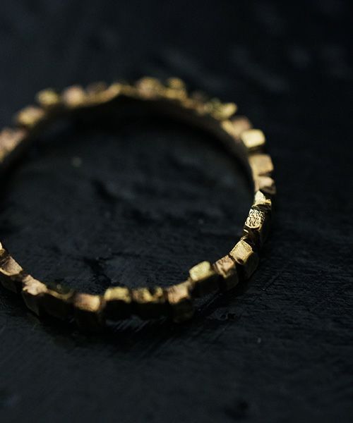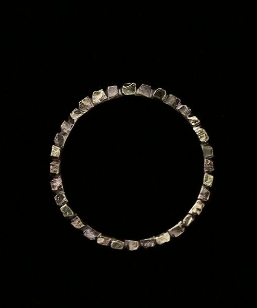 程よい強さを感じるデザインでありながら、他のリングとの重ねづけにも馴染みます。よく見るとひとつひとつのモチーフは均一ではなく、それぞれ形が違います。単体ではもちろん、重ねづけで様々な楽しみ方ができるリングです。