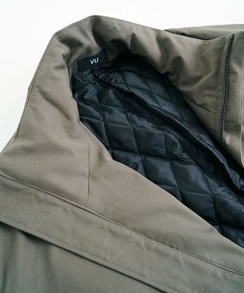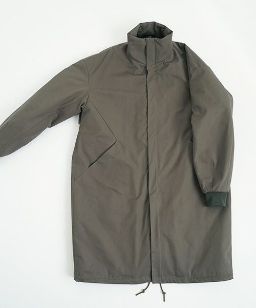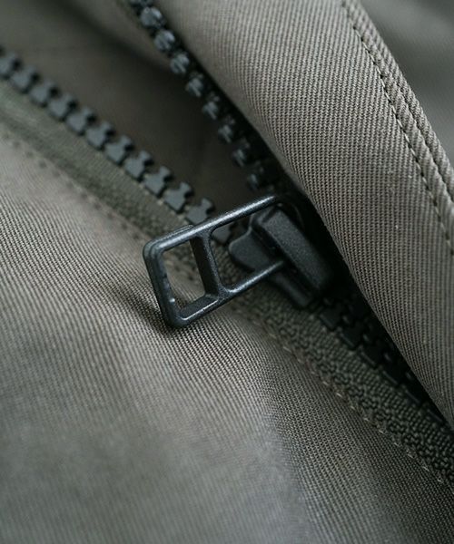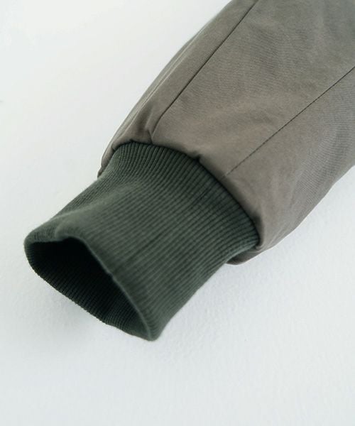 MA-1をコートにしたイメージで作られたこのコートは、その特徴を感じることができます。衿元には中綿入りの大きめのスタンドカラーデザインがあり、暖かさと機能性を兼ね備えています。袖はリブ仕上げで、バルーンシルエットになっています。また、前身のジップを開けると、ジグザグステッチが施された持ち出しのディテールが特徴的です。