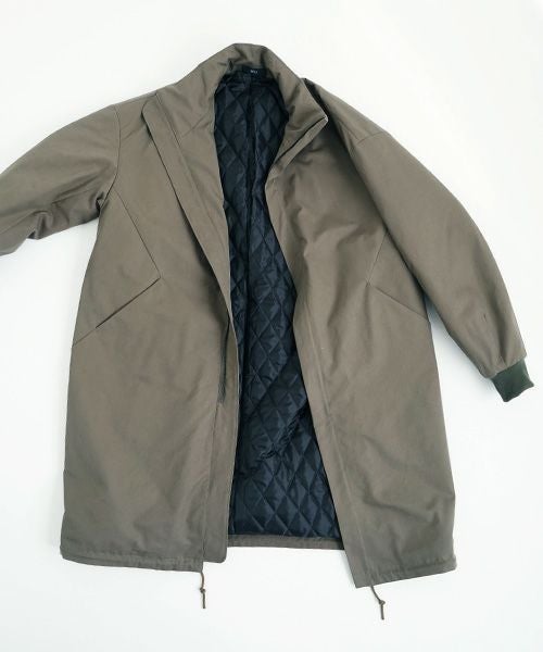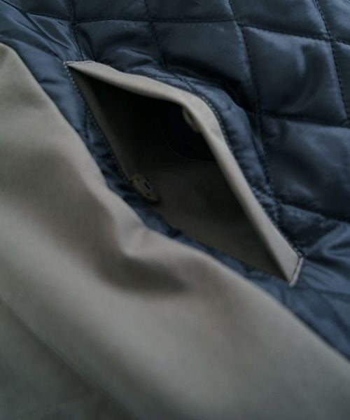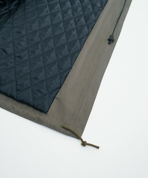 このコートの表地には、最高峰のコットンブランド「フィンクスコットン」を使用しています。特殊な加工により、マットでぬめり感のある優しい肌触りの厚手の生地でしっかりと仕上げられています。裏地には、ふんわりとしたシルエットを演出するために、格子のキルト生地が使われています。