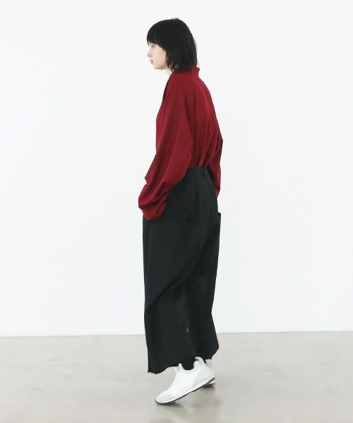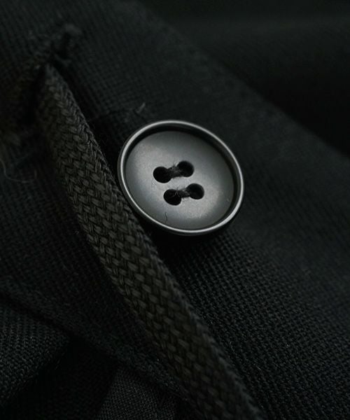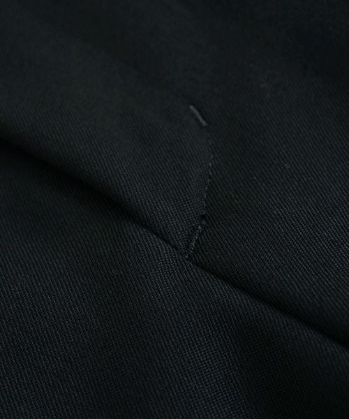 裾サイドのボックススリットが特徴的な「box slit psnts」。 サイドの裾にボックスプリーツをとることによって、着用時に独特の揺れ感が生まれます。 生地にはツヤ・膨らみ・しなやかさを併せ持つ三位一体のウール100%素材仕様。 ウエストにはドローコード仕様で幅広いニーズに。前後ウエストベルトから2タック持たせることで着用時、ストレスない着用感。バックポケットは主張しないシームポケットに。 「short jacket」と同素材使いでセットアップ合わせでコーディネートをお楽しみいただけます。made in japan※裾のボックススリットはデザイン上、まつり縫いで縫製しております。ボックススリットで一部、開いた箇所がございますのでそちらに間違えて足を通さないようにご注意ください。まつり縫いが取れる可能性がございます。