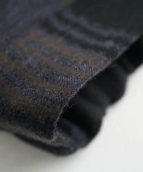 コットンとウールの糸でオリジナルチェック柄のジャガード生地を日本の産地兵庫県西脇市の機織り工場で作りました。完全オリジナルデザインのチェック柄です。コットンとウールをミックスで織り上げたあと、仕上げを加工でウールとコットンが混ざっていることによって、凹凸のある表面感豊かな生地に仕上がっています。